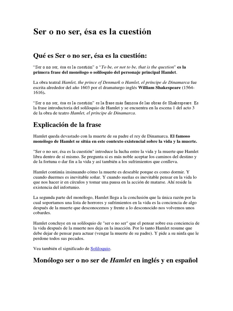 Up to 3 cash back En el monlogo de Hamlet el ser o no ser se puede entender mas facilmente si se modifica la frase a vivir o morir En ese monlogo el protagonista se cuestiona. El monólogo de Hamlet tiene como tema principal gira entorno a la venganza llevada a cabo por el príncipe Hamlet para vengar la muerte de su padre. Myriam Prevel y Lucia Castro Qué es un monólogo.